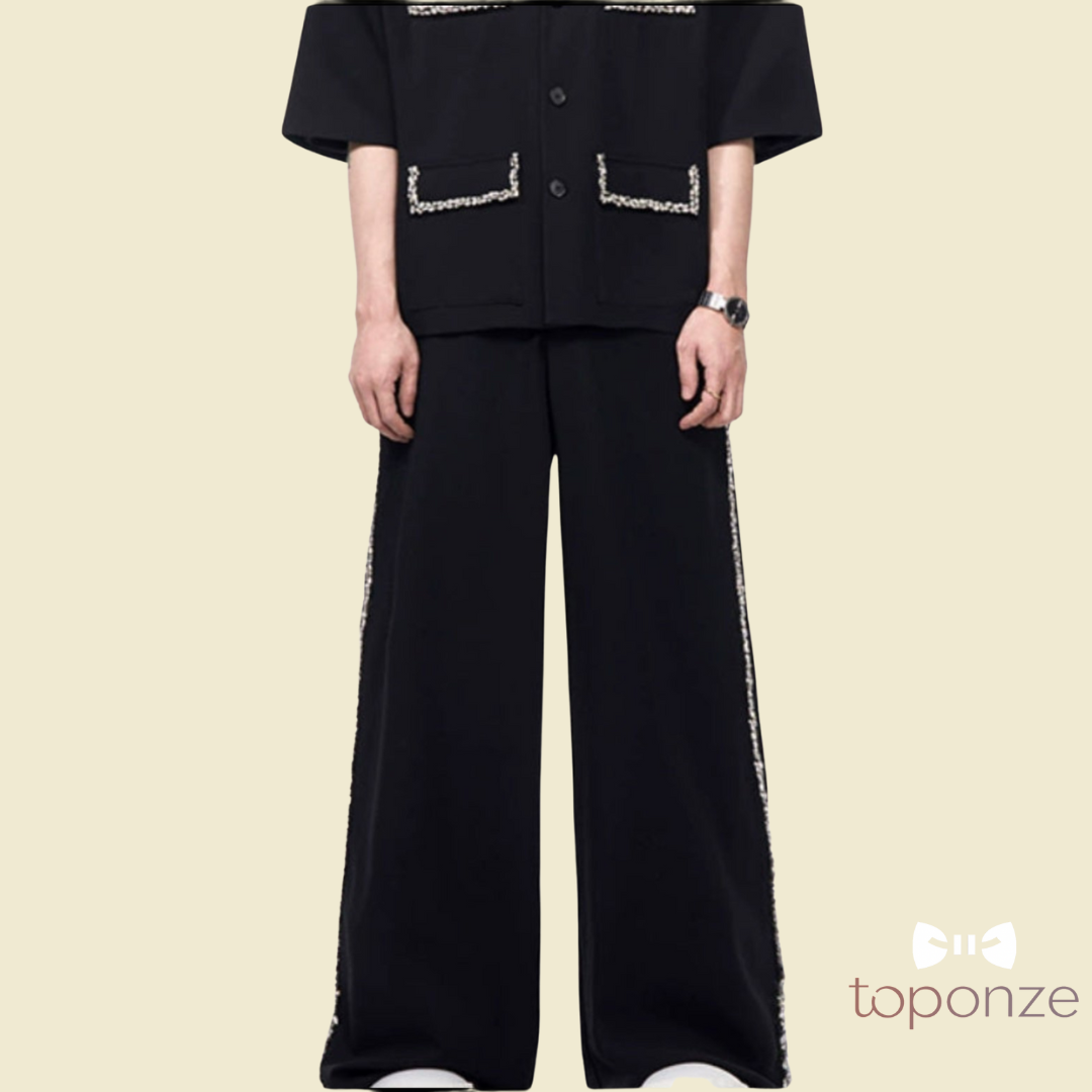 The Black Deluxe Pants complete the look with a fluid wide-leg cut, highlighted by pearly side applications that create a striking visual contrast.