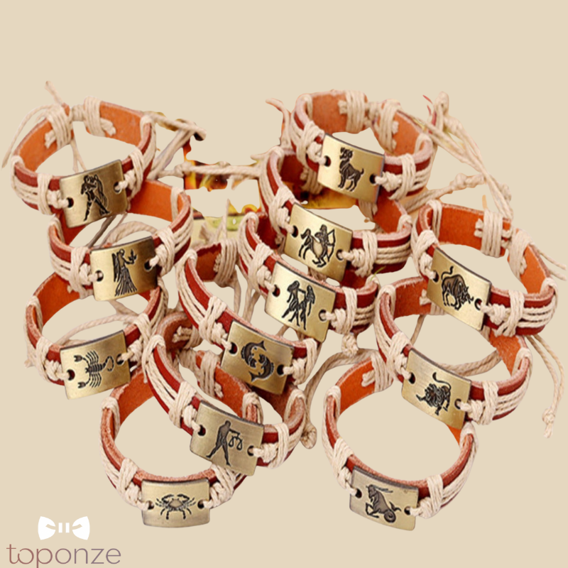 Pulseira Masculina Couro com Signos do Zodíaco — Estilo Artesanal