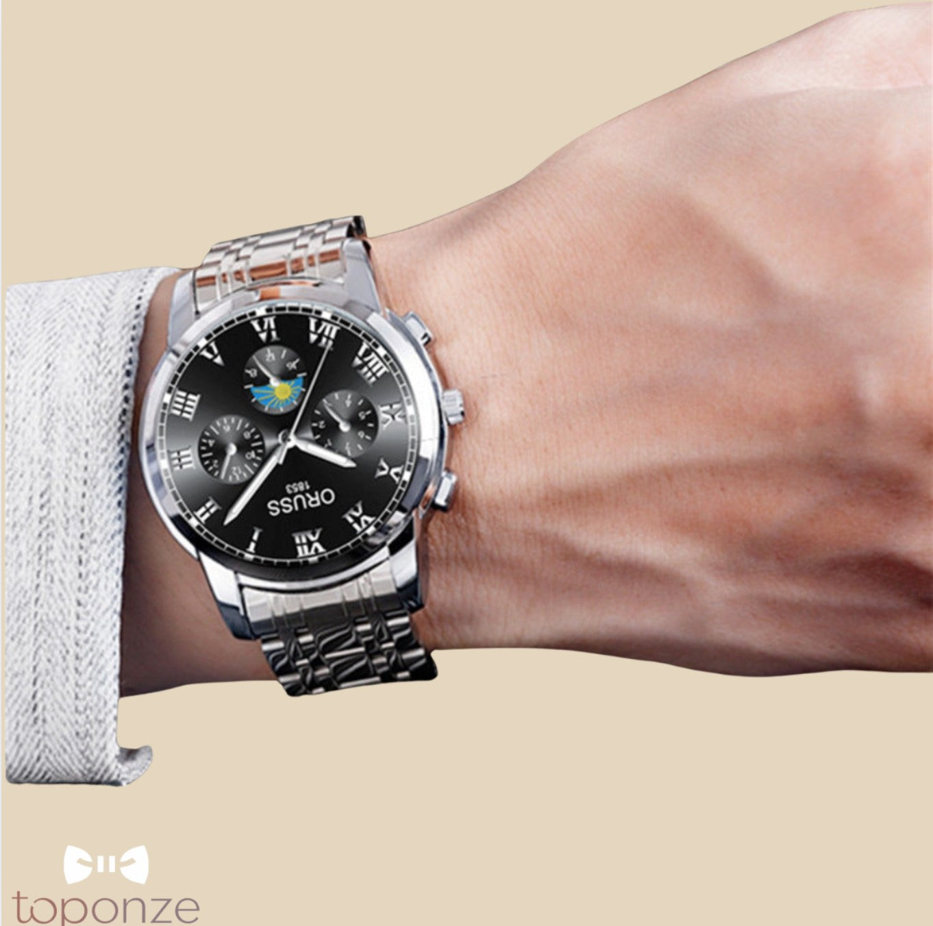 O Relógio ORUSS 1853 é uma obra-prima de design e precisão. Feito para homens que valorizam elegância e poder, este modelo combina o estilo clássico dos ponteiros romanos com a sofisticação moderna do aço inoxidável em preto polido. Cada detalhe reflete bom gosto e confiança — um verdadeiro símbolo de luxo intemporal.