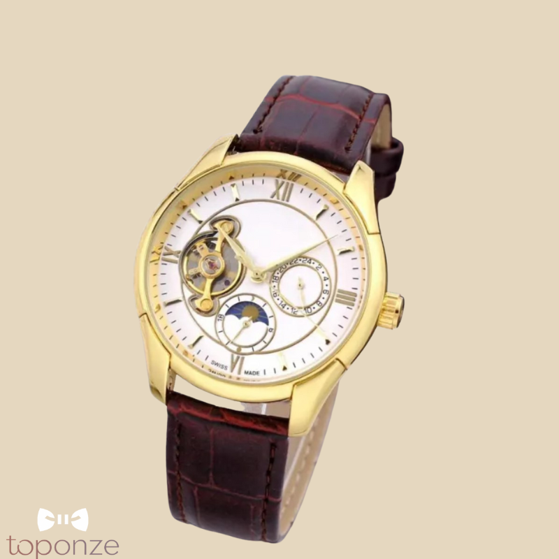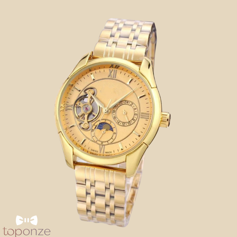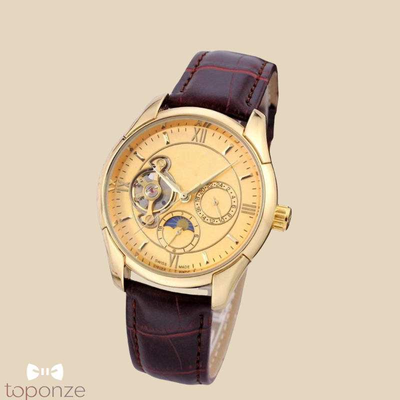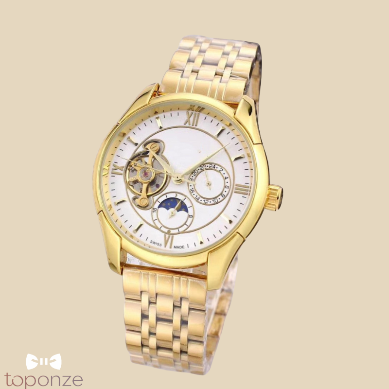 O mostrador multifuncional exibe detalhes refinados como indicador lunar, submostradores decorativos e marcadores romanos, tornando-o uma peça perfeita para homens que valorizam estilo e distinção.